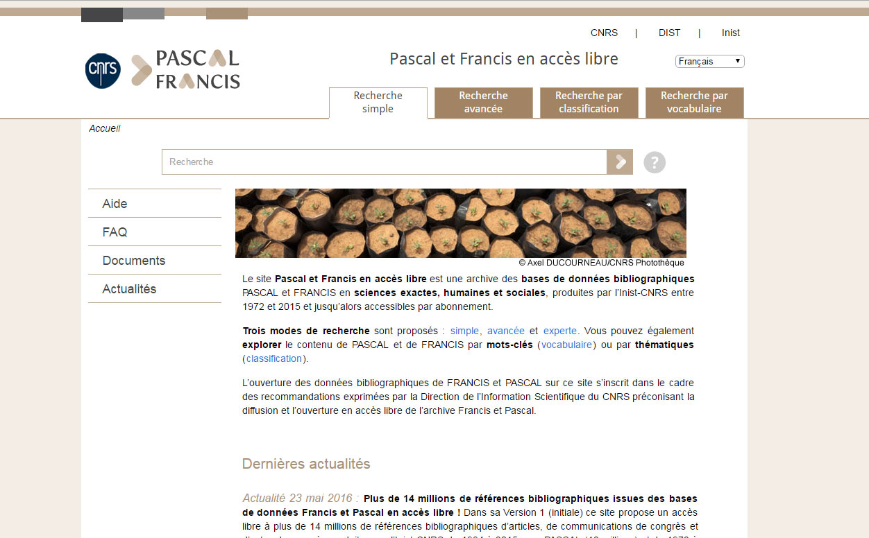 Archive des bases de données bibliographiques PASCAL et FRANCIS en sciences exactes, humaines et sociales, produites par l’Inist-CNRS entre 1972 et 2015.